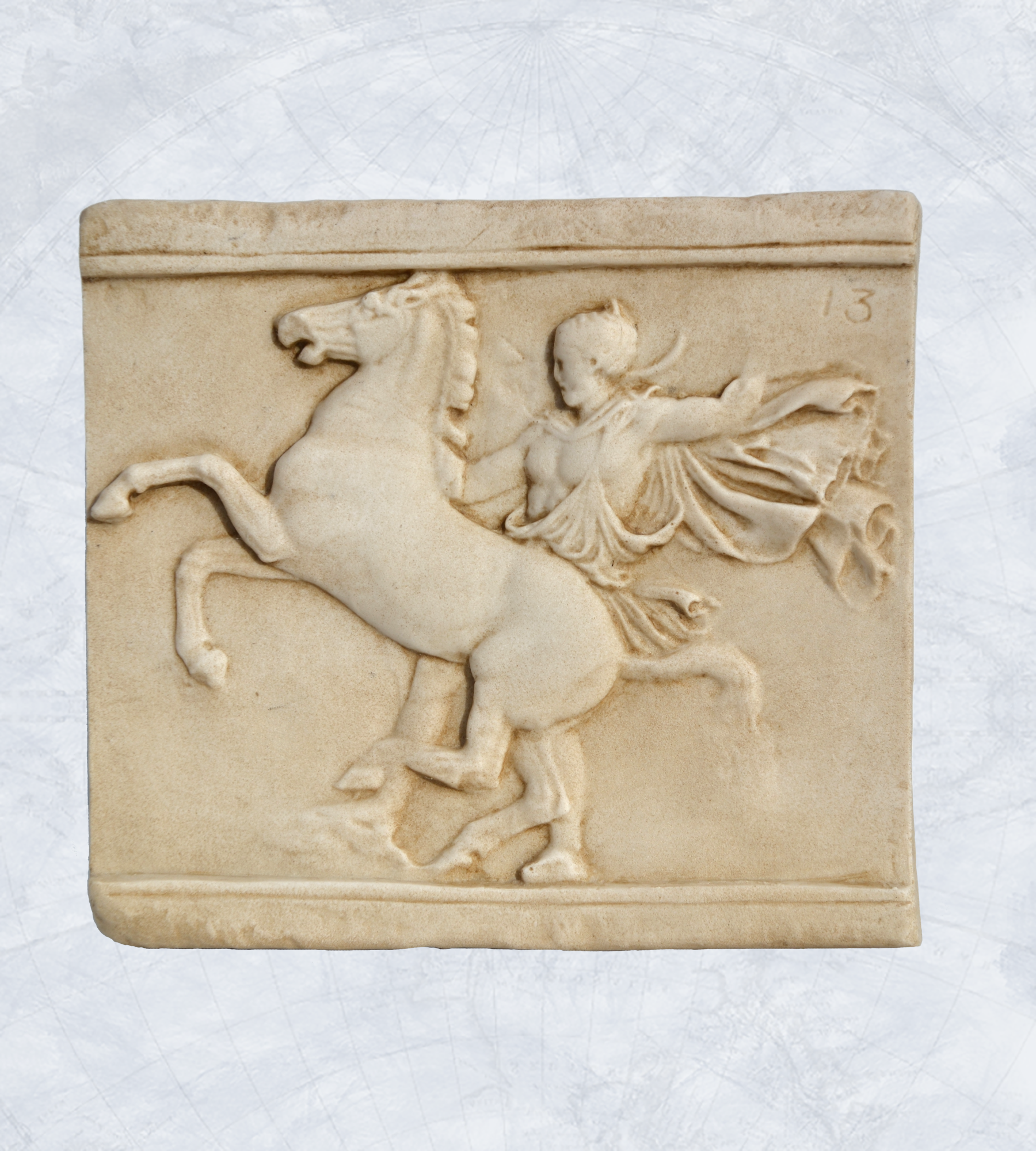 Description: Reducción de bajorrelieve. El relieve original, en mármol, formaba parte del friso del Partenón y se conserva en el Museo Británico de Londres. Vaciado original comprado por Thomas Bruce, VII conde de Elgin.